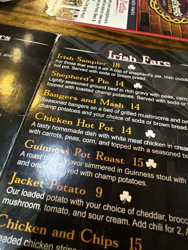 A roast bold in flavor simmered in Guinness Stout with baby carrots, onions, and red potatoes. Served with Champ potatoes.