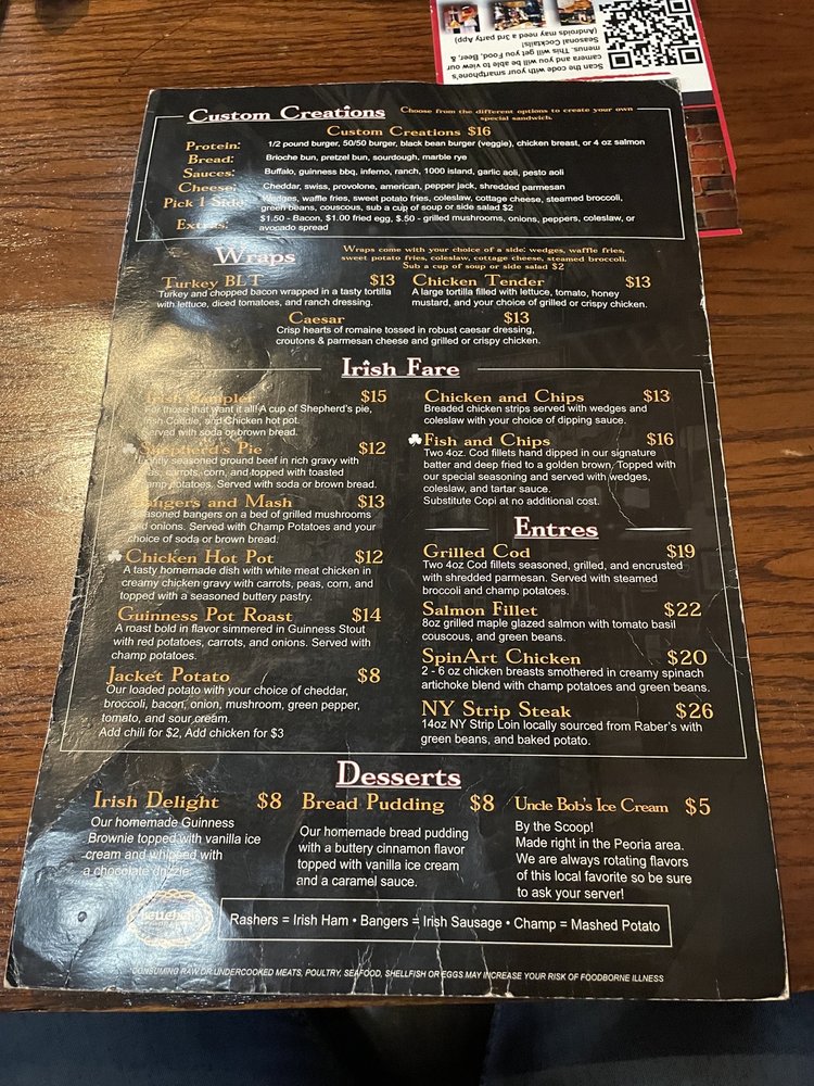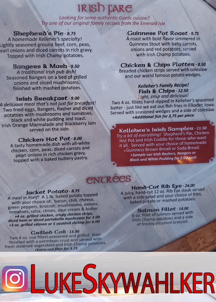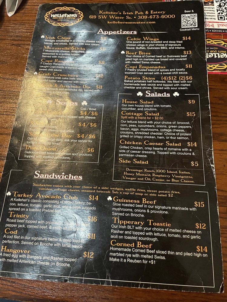 Kelleher’s Irish Pub and Eatery, located in Peoria, IL, offers a cozy and welcoming ambiance with wood beams and dim lighting. The menu features delightful options like 1\2 Potato Skins, Beef Bites, Cottage Salad, Turkey BLT Wrap, and more. Customers rave about the scrumptious Irish coddle, spinach artichoke dip, fish and chips, and shepherd's pie. The atmosphere makes you feel like you're in Ireland, with friendly staff like Chris to enhance your dining experience. The pub also offers a variety of drinks and beers to accompany your meal. With reasonable prices and exceptional service highlighted by servers like Ally, Kelleher’s Irish Pub and Eatery is a must-visit for those looking for delicious food and a welcoming atmosphere.